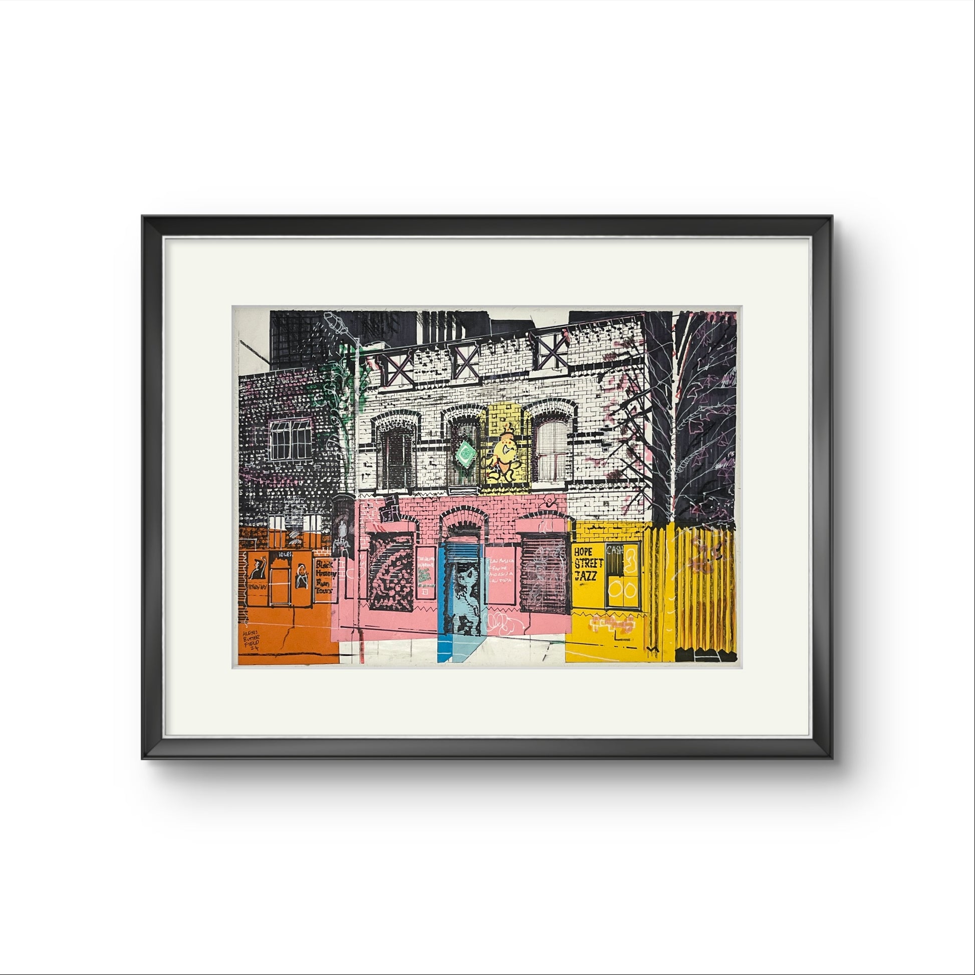 Pen, crayon and brushed ink drawing over collage on 300gm hot pressed paper
