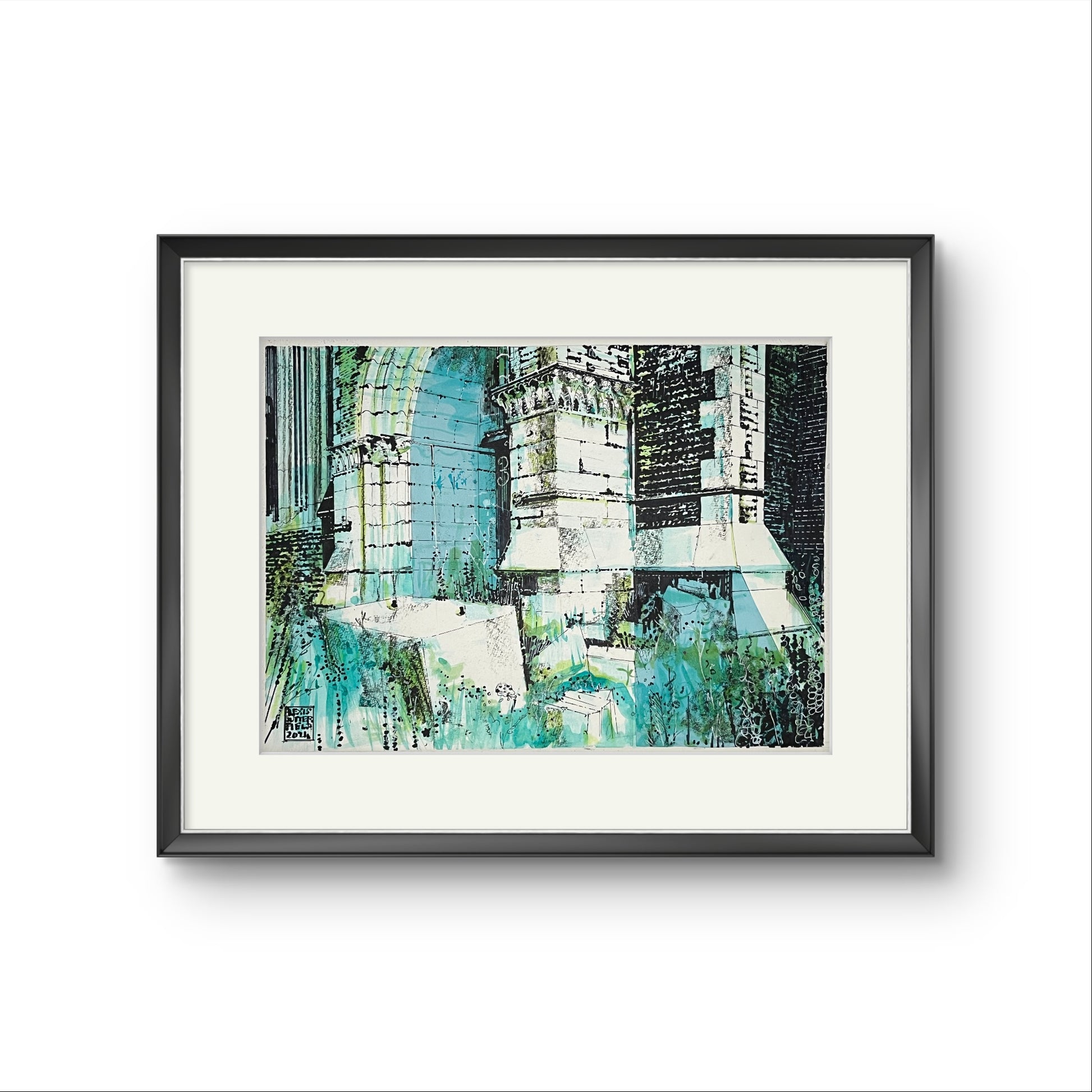 Pen, crayon and brushed ink drawing over collage on 300gm hot pressed paper